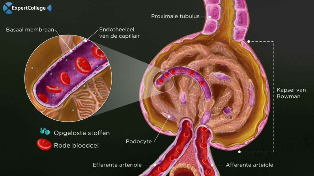 In de nier bevinden zich meerdere nefronen. Dit zijn de basiseenheden van de nier waarin bloed gefilterd en urine geproduceerd wordt. Een belangrijk onderdeel hiervan is de glomerulus. Dit is een verzameling aan capillairen die omgeven worden door een kapsel van Bowman. Via de afferente arteriole stroomt ongefilterd bloed de glomerulus in. De druk in de glomerulus is zo hoog dat […]